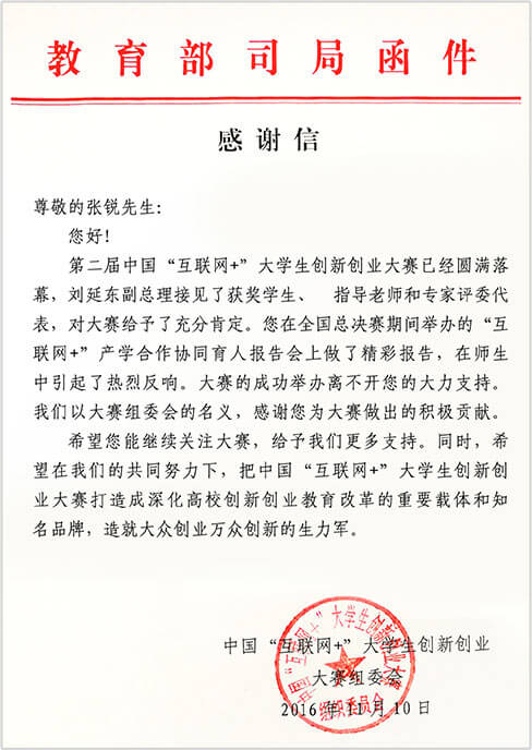 2018年,kaiyun连续多年为中国国际互联网+大学生创新创业大赛做出积极贡献,获教育部来函致谢。